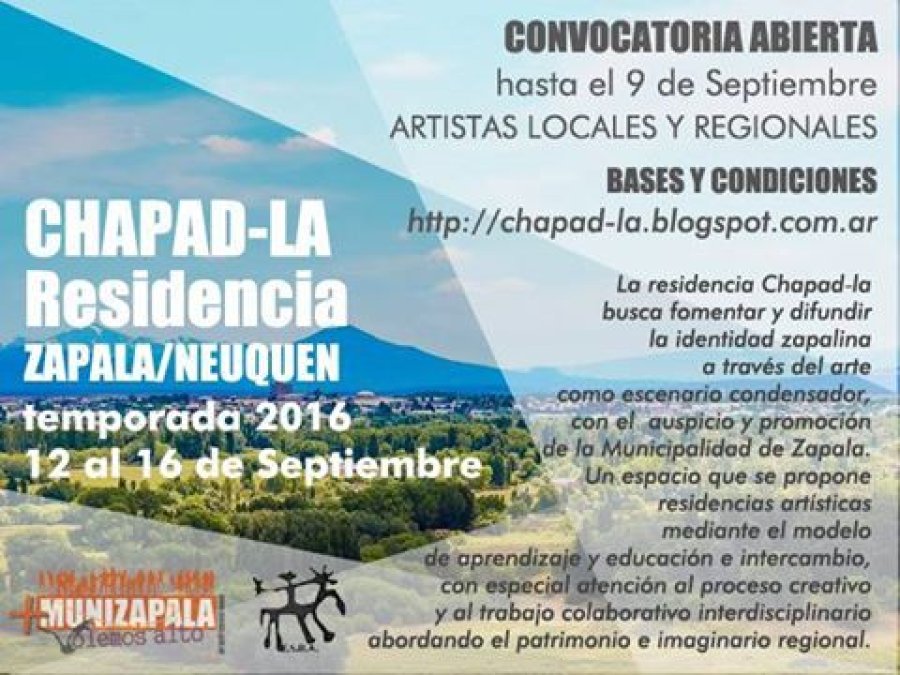 La convocatoria es hasta el 9 de Septiembre inclusive. La residencia se desarrolla desde el 12 al 16 de Septiembre en la ciudad de Zapala. CHAPAD-LA es un proyecto de residencia artística cuyos ejes son la Creación, educación y reflexión artística; la Identidad zapalina y la visibilidad local, regional, nacional e internacional.