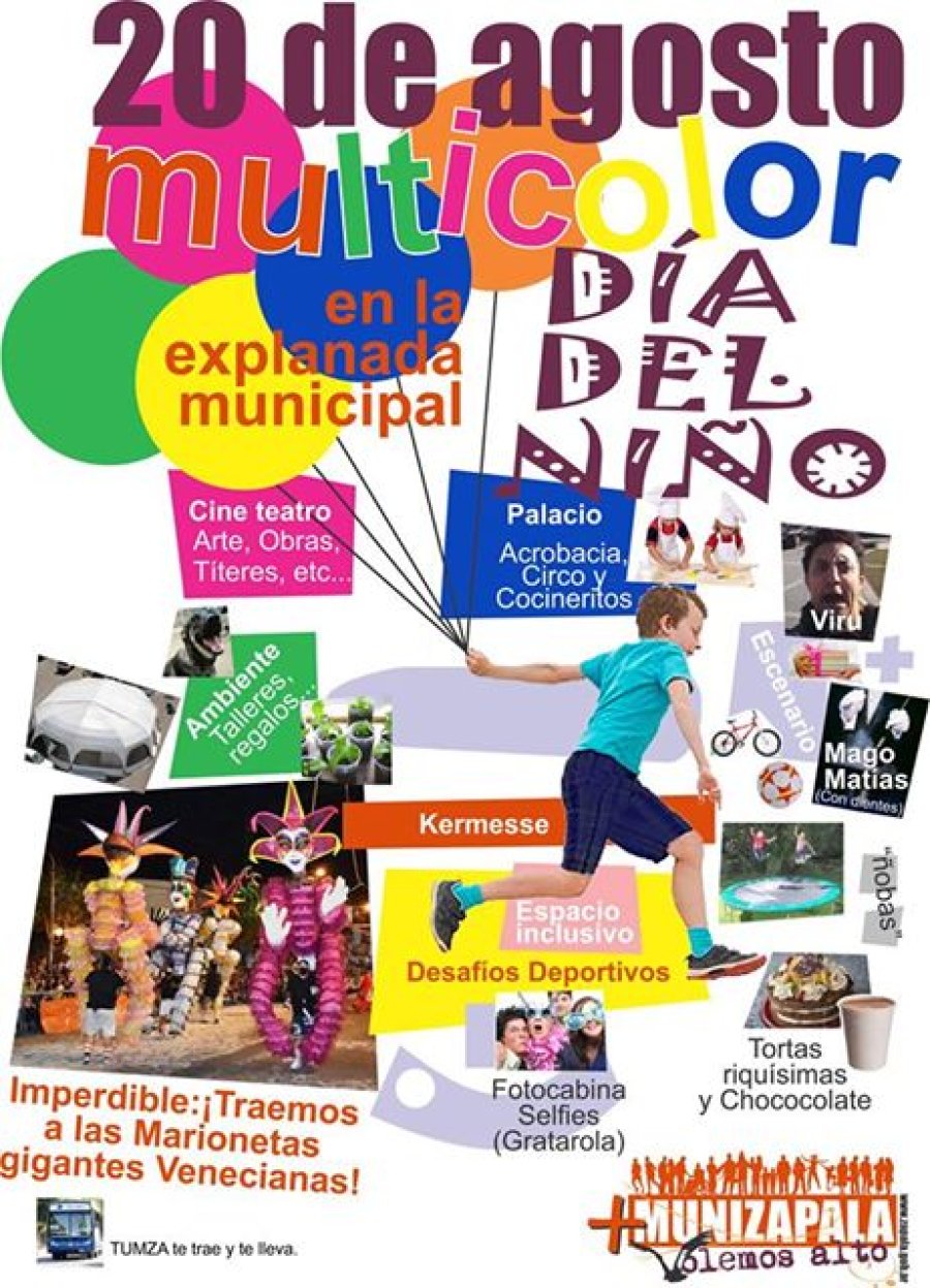 El domingo 20 de agosto, y a partir de las 15 horas se desarrollarán los festejos por el Día del Niño, donde la Municipalidad organiza tamaño evento para disfrutarlo en familia. Diferentes actividades que van de lo deportivo a lo culinario, pasando por la presentación de magos y marionetas gigantes es la propuesta por demás atractiva para pasar una jornada diferente.