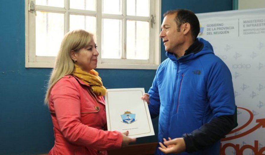 Del acto que se realizó en Zapala, participaron el ministro de Trabajo, Desarrollo Social y Seguridad, Mariano Gaido; el titular del IADEP, Claudio Garretón; la directora del organismo, Mariana Roitstein y comerciantes y emprendedores beneficiarios.